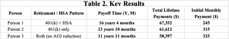 The results quantify how AGI-reducing contributions slow repayment and raise total loan costs, while Roth contributions accelerate payoff.