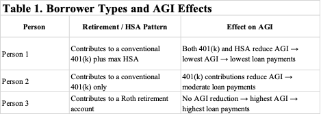 Borrowers who contribute to conventional 401(k) plans and Health Savings Accounts (HSAs) lower their Adjusted Gross Income (AGI), which reduces early RAP payments but lengthens the repayment period and increases total lifetime payments.