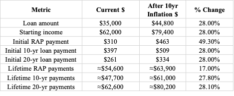 Note: Lifetime RAP payments rise more slowly than the initial monthly payment because higher RAP payments shorten repayment time—from about 176 months (14.7 years) in the baseline to about 138 months (11.5 years) after 10 years of inflation.