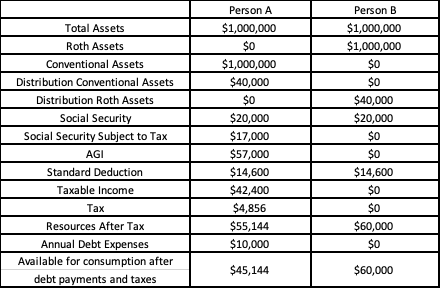 Consider two people both with $1,000,000 in financial assets and with $20,000 in Security benefits, both distributing four percent of financial assets ($40,000) from a retirement account. Person A has $10,000 in debt and all financial assets in a conventional retirement account. Person B has $40,000 no debt and $40,000 in a retirement account.