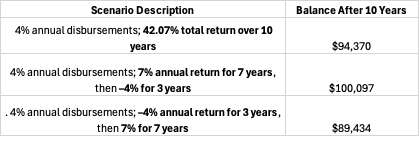 Even when the total return over 10 years is the same (e.g., +41.07%), the sequence of returns absolutely matterswhen there are withdrawals (or contributions) involved.