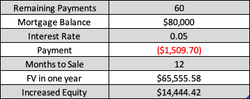The table below provides an estimate of the additional equity obtained from delaying downsizing for one year when the mortgage has 60 months remaining, an $80,000 outstanding balance and a 5.0 percent interest rate.