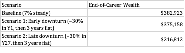 - Scenario 2 (late-career shock): 7% through year 26, then –30% in year 27, followed by 0% in years 28–30
