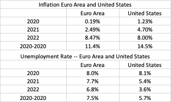· The aggregate growth in prices over the three years was 11.4 percent for the Euro Area compared to 14.5 percent for the United State. The differential was around a point higher per year in the United States than the Euro area. However, by 2022 the inflation rate was lower in the United States than in the Euro area.