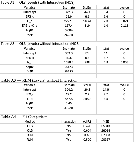 The primary specification is a robust (Huber) linear model with price regressed on centered earnings, centered expected sales growth, and their interaction. The interaction tests whether the price–earnings slope varies with growth. Ordinary least squares with HC3-robust errors was estimated for comparison.