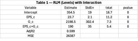 Table 1 reports the robust linear specification including the interaction. Earnings and expected sales growth are individually significant, and the interaction term is also statistically significant in the robust linear model. This indicates that the pricing of earnings is not uniform across growth levels: the market appears to pay more per dollar of earnings when expected growth is above average.